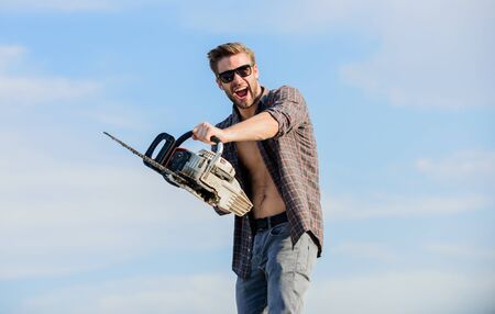 Handsome man with chainsaw blue sky background. Gardener lumberjack equipment. Sharp blade. Dangerous job. Feeling manly. Powerful chainsaw. Lumberjack with chainsaw in his hands. Masculinity concept