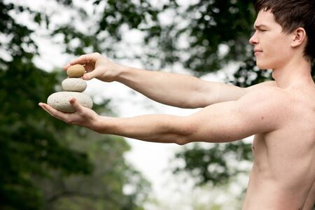 Strong athletic man holding a pile of stones in balance. Get the balance concept.