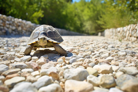 A small turtle crawls cautiously along a stone wall, showcasing its textured shell amidst a peaceful, natural setting filled with greenery.