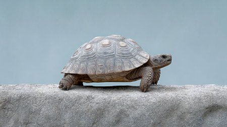 A detailed close-up of a tortoise walking on a rock surface, featuring a soft blue background that highlights its textured shell and serene demeanor.