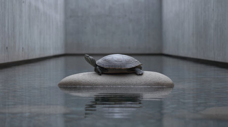 A serene turtle rests on a smooth stone in calm water within a minimalist concrete space, capturing the beauty of solitude and tranquility in nature.