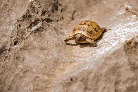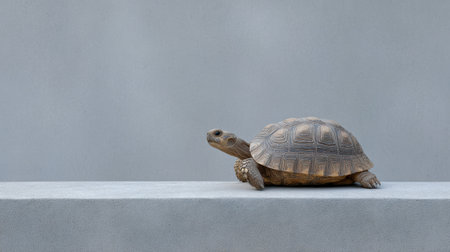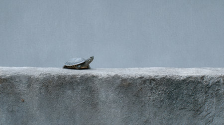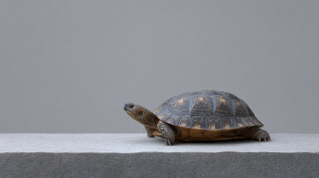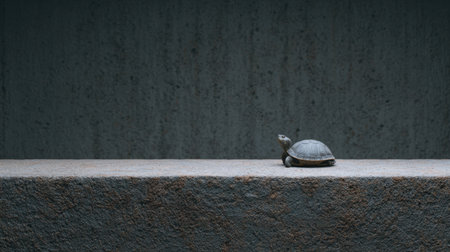A solitary turtle crawls along a gray stone surface, embodying a sense of tranquility and minimalism, perfect for nature photography enthusiasts.