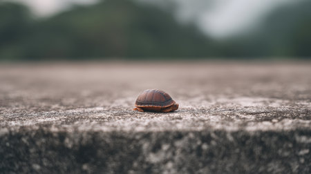 A small turtle shell rests on a concrete surface, showcasing its intricate texture against a blurred natural background. Perfect for themes of tranquility.