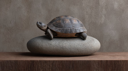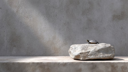 A serene and minimalist scene featuring a turtle resting on a smooth rock against a softly textured gray background, evoking calm and tranquility.