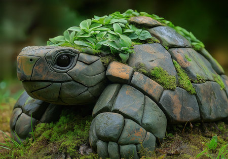 A striking close-up of a turtle nestled in vibrant greenery, showcasing its detailed features and calm demeanor, illuminated by soft sunlight in a peaceful environment.