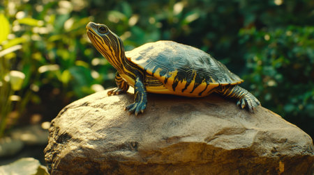 A vibrant turtle rests on a sunlit rock amidst lush greenery. This serene wildlife scene captures the natural beauty of reptiles in their habitat.