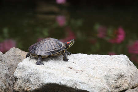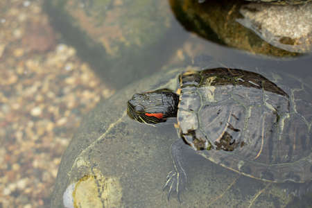 Red Eared Terrapin - Trachemys scripta elegans. Red eared slider turtle in the summer sunlight.
