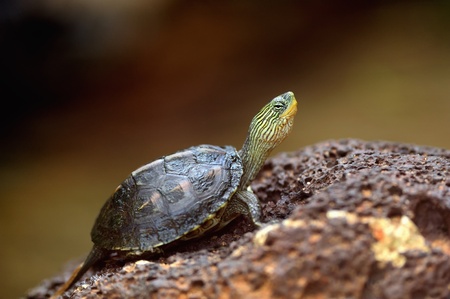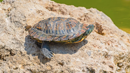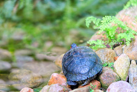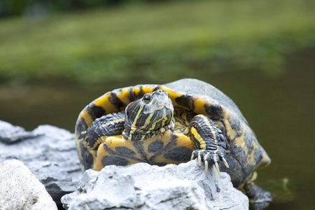 portrait of freshwater pond turtle with yellow stripes and brown shell, on the rocks near the pond,