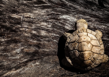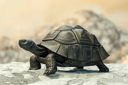 A small turtle crawls slowly across a rough surface, highlighting its shell against a dark, textured background, representing nature's beauty and tranquility.