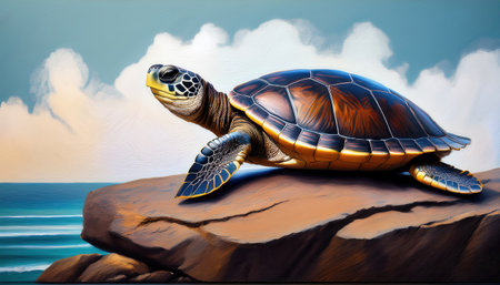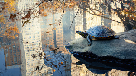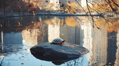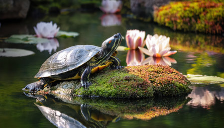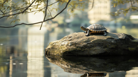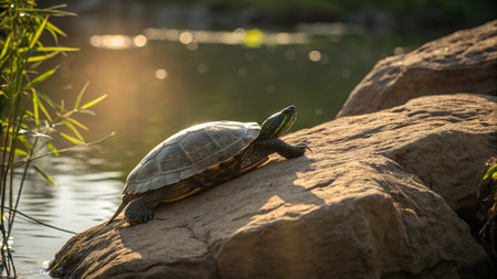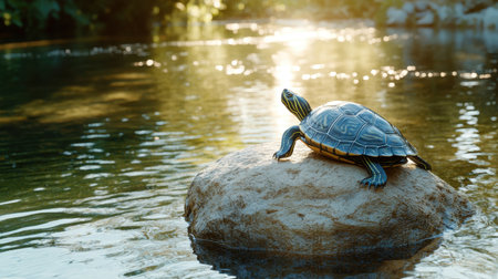 A tranquil scene featuring a turtle resting on a rock illuminated by sunlight. The calm water reflects the serene environment, showcasing nature's beauty and intricate details.