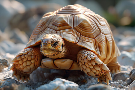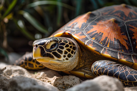 A stunning close-up of a turtle resting on a stone surface, showcasing intricate details of its textured shell in a serene natural environment.