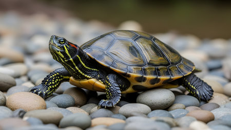 A close-up view of a turtle walking across smooth river stones. The reptile's patterned shell and striped skin are sharply focused against the blurred background of the natural rocky environment.