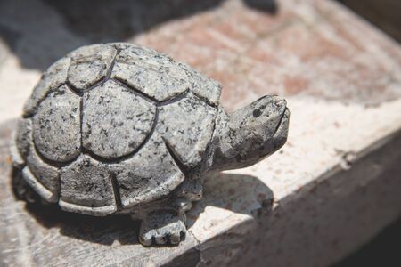 A small turtle rests on a weathered concrete surface, surrounded by muted natural tones, creating a serene and tranquil atmosphere ideal for wildlife photography.