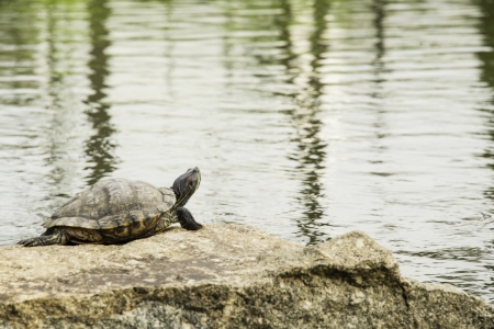 A turtle sunbathing next to pond at Bangkok city park or Lumpini Park, Thailand
