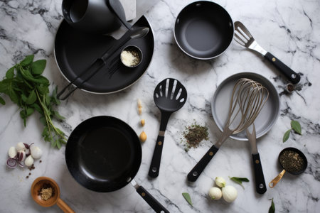 tasteful flatlay of cooking utensils on marble surface, created with generative ai