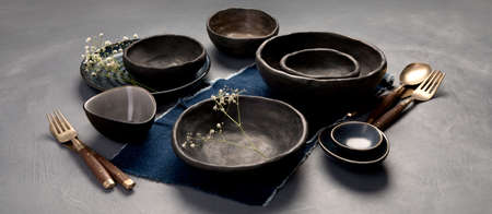 Table setting with a black and blue plates on gray background. Minimalism concept. Panorama