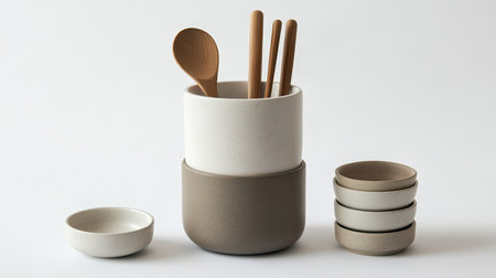 A stylish arrangement of kitchen utensils including bowls and wooden spoons in a clean, minimalist design, perfect for modern home decor and culinary settings.