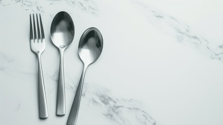 Spoon, fork and knife on white marble background with copy space