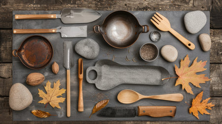 A collection of rustic kitchen utensils, including a cast iron pan, wooden spoons, and a knife, are arranged on a slate board with autumn leaves and stones.