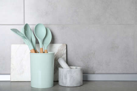 Set of different cooking utensils on gray countertop in kitchen. Space for text