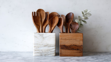 This image features beautifully crafted wooden cooking utensils displayed in elegant marble and wood holders, set against a light marble background. Perfect for showcasing kitchen style.