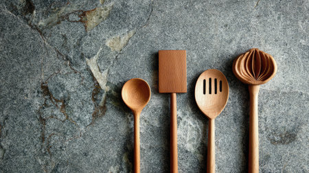 Aesthetic arrangement of wooden kitchen utensils on a dark stone backdrop, perfect for showcasing culinary artistry and modern kitchen design.