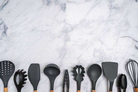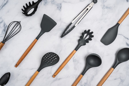 A collection of stylish black kitchen utensils rests on a stunning marble surface, highlighting a modern and sophisticated approach to cooking. The utensils are ready for culinary creativity.