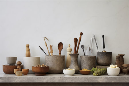 Harmonious Display: Array of Kitchen Utensils, Mortars with Pestles, Adorn Gleaming Marble Counter Amid Serene Wall Décor