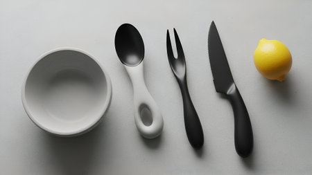 Overhead flat lay of sleek black cutlery, a white ceramic bowl, and a vibrant yellow lemon, neatly arranged on a light grey background. Ideal for modern culinary themes.