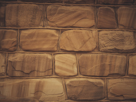 Detailed view of a rustic wall constructed from sandstone bricks, showcasing earthy tones and organic patterns under soft lighting.