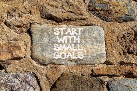 Start with small goals symbol. Concept words phrase Start with small goals on beautiful gray stone wall. Beautiful stone wall background. Business Start with small goals concept. Copy space.