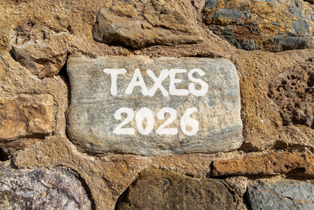 Taxes 2026 new year symbol. Concept words Taxes 2026 on beautiful gray stone on stone wall. Beautiful stone wall background. Business and taxes 2026 new year concept. Copy space.