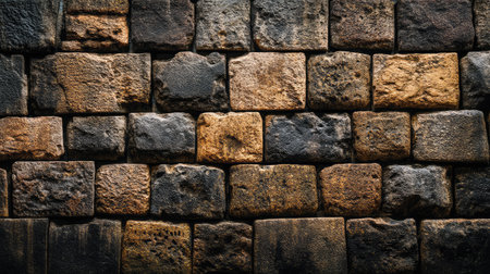 A stunning stone wall composed of various textured bricks, highlighting a blend of dark and light shades, ideal for backgrounds in design, architecture, and decor projects.