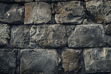 Detailed close-up of a dark stone wall with an irregular pattern and weathered textures, perfect for use in design projects, backgrounds, or architectural visualizations.