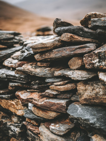A close-up shot showcasing a stack of rough-hewn grey stones, creating a textured and layered background.
