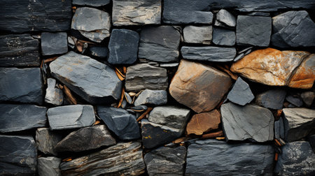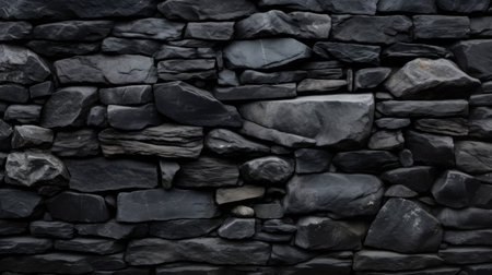 A full frame close-up of a dark grey stacked stone wall featuring rough textured rectangular and irregular shaped...