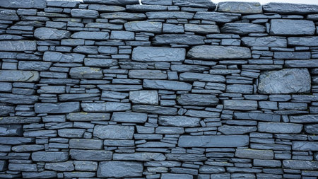 A weathered dry stone wall made of dark grey slate pieces, featuring moss and lichen, creating a rustic textured...