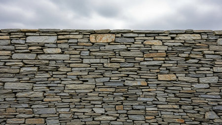 A piece of history stands isolated, showcasing the timeless craft of dry stone walling. Each weathered stone, covered in moss and lichen, tells a story of endurance against the elements, representing strength, tradition, and natural boundaries.