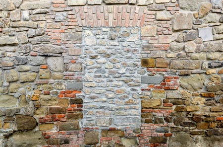 Ancient georgian natural stone wall of different sizes and brick. Textured background.