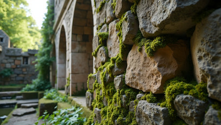 Mystical medieval castle wall with weathered stones and delicate greenery