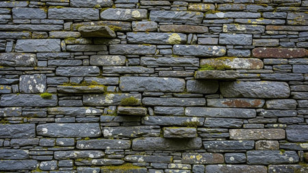 A detailed close-up of a rustic stone wall, featuring grey stones, moss, and lichen, showcasing natural texture and...