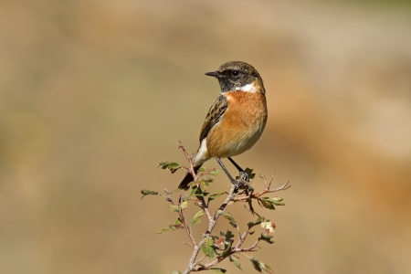 little bird clinging to a dry branch, European Stonechat, Saxicola rubicola