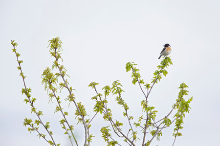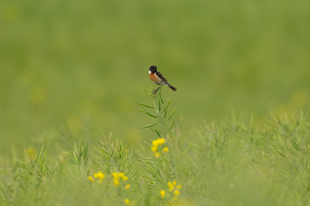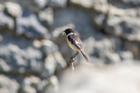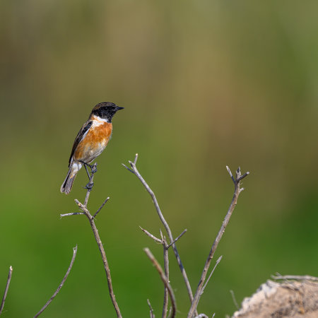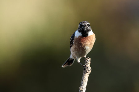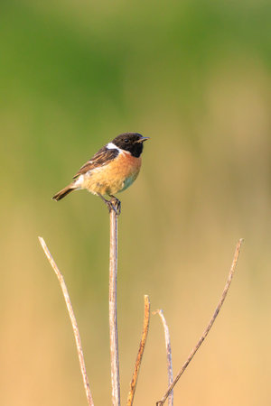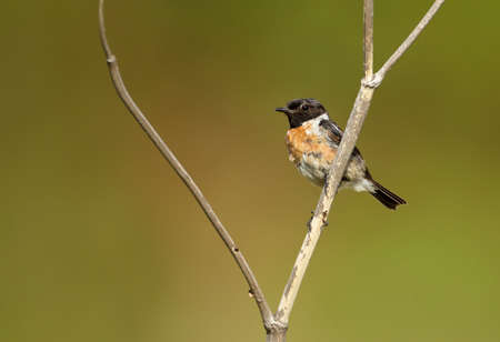 Beautiful nature scene with European stonechat (Saxicola rubicola). Wildlife shot of European stonechat (Saxicola rubicola) on the branch.