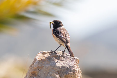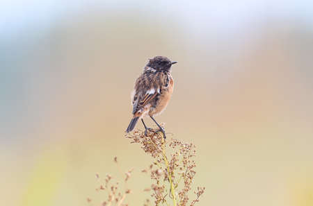 European stonechat perched on a branch against colorful clear background, UK. Birds in parks and meadows.