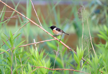 A common stonechat (Saxicola torquatus) sitting on a small twig, sunny day in summer, northern France