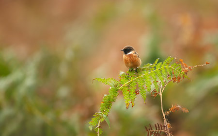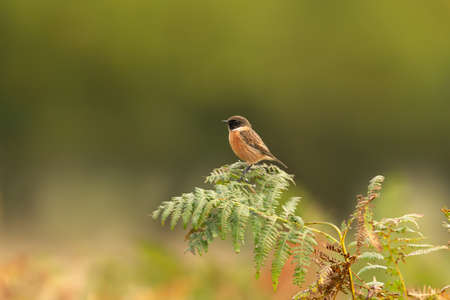 European stonechat perching on a fern branch against colorful background in natural surrounding, UK.