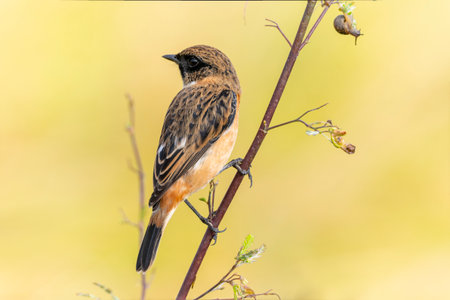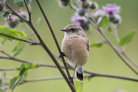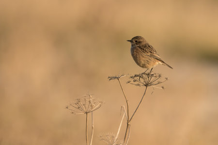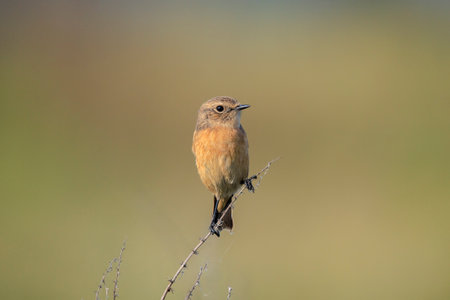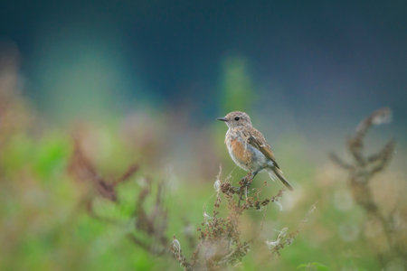 A selective focus shot of female Saxicola rubicola perched on a plant