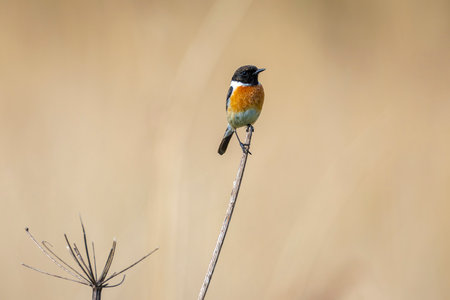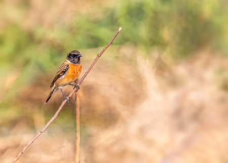 Male European stonechat (Saxicola rubicola) sits on a thin branch of dry grass