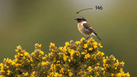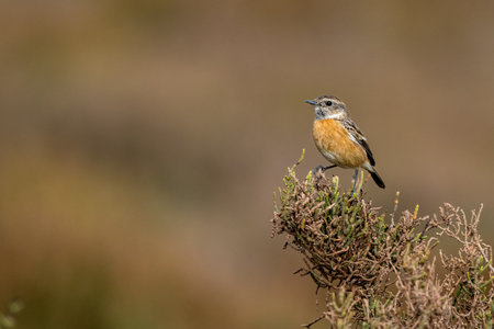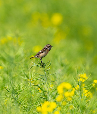 A common stonechat (Saxicola rubicola) perched on a yellow gorse.