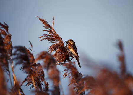 European stonechat perched in Lagoa Pequena in Sesimbra.